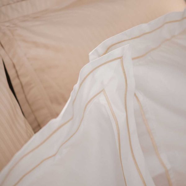השילוב בין אריגת הסאטן המבריקה בעדינות לבין הגימור הזהוב יוצר מראה מאוזן, על-זמני ואלגנטי, המתאים לכל סגנון חדר שינה.