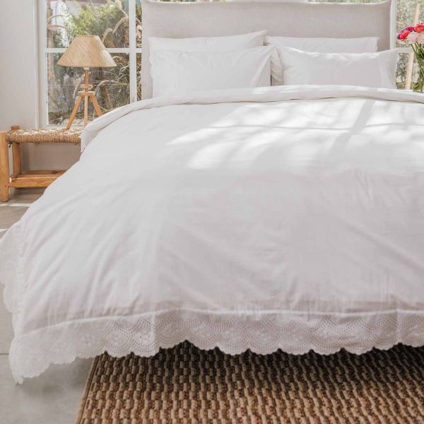 שילוב של בד לבן קלאסי עם סיומת תחרה רקומה מעניק למצעים מראה רך, רומנטי ועל-זמני, המשדרג כל חדר שינה באלגנטיות שקטה.