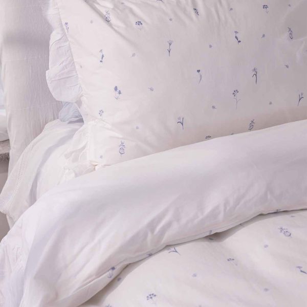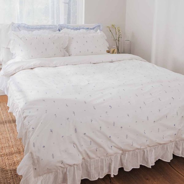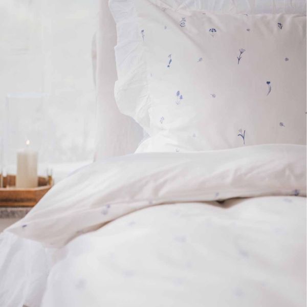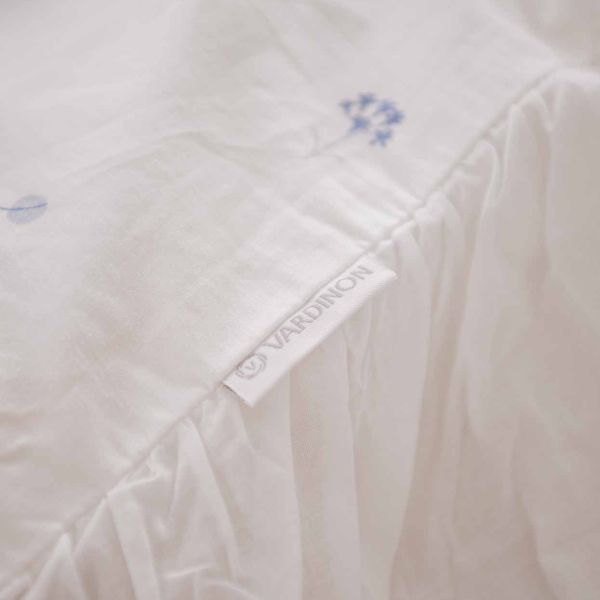הדגם מעוטר בדפוס עדין של פרחי פעמונית קטנטנים בצבע כחול, המעניקים למראה הכללי תחושה רכה, רגועה וקלאסית. להשלמת העיצוב, המצעים מגיעים עם שולי מכפלת רחבה, התפורים בכיווצים מבד כותנה דקיקה ועדינה, היוצרים אפקט רומנטי עשיר ומטופל ומעניקים למיטה מראה מוקפד ובעל נוכחות.